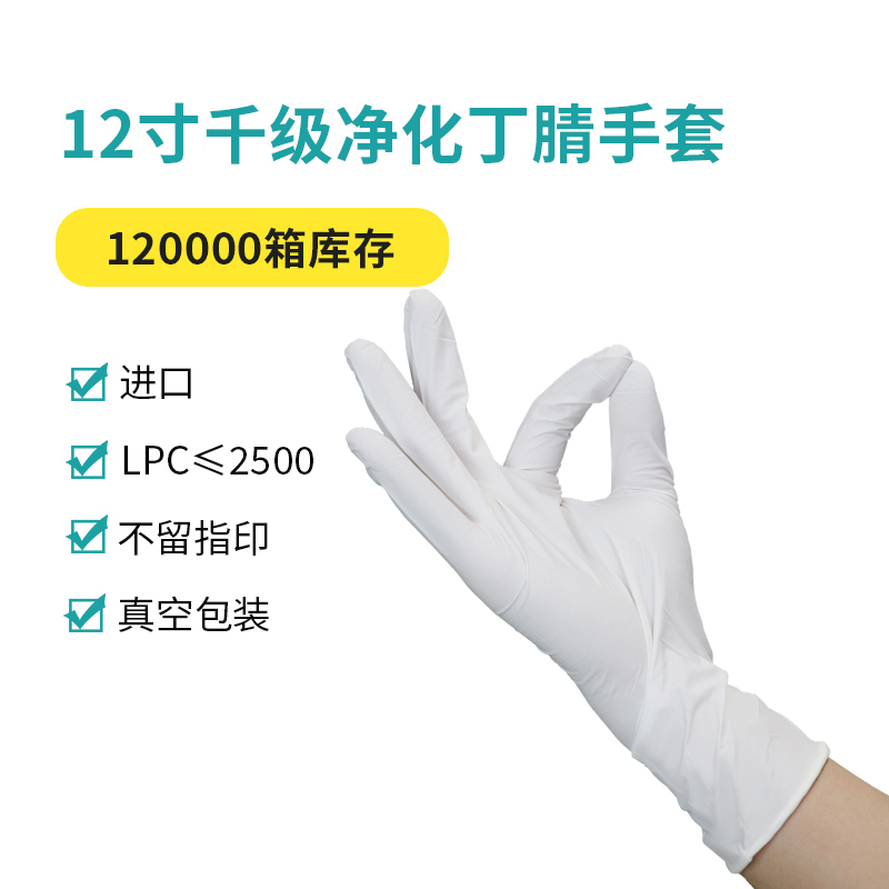 长度≥280MM,主要成分是丁腈橡胶,这是一种由丙烯腈和丁二烯通过乳液聚合制成的合成橡胶。需要注意的是,对于净化千级级别的手套,其生产过程和所使用的原材料都必须严格控制,以确保最终产品符合极高的洁净度标准,无尘、且化学残留物处于极低水平,LPC(颗粒大小0.5-230μm)2500以下。