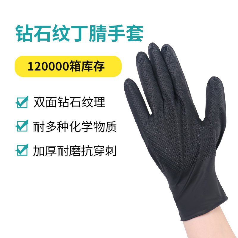 不含乳胶蛋白,杜绝由天然乳胶带来的过敏,具备防护多种化学物质能力,双面钻石纹理,增强摩擦力,弹性佳、耐磨抗穿刺,又兼有舒适手感,可用于工业生产、汽车修理、食品加工、卫生清洁、化学加工等作业。