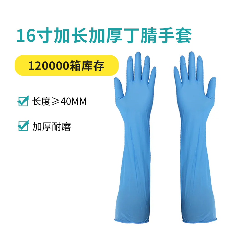 16寸蓝色丁腈手套凭借加长设计、高防护性和耐化学性,广泛应用于以下场景:医疗与生物安全领域· 高风险操作:适用于传染病隔离、解剖实验等需全身防护的场景。· 消毒